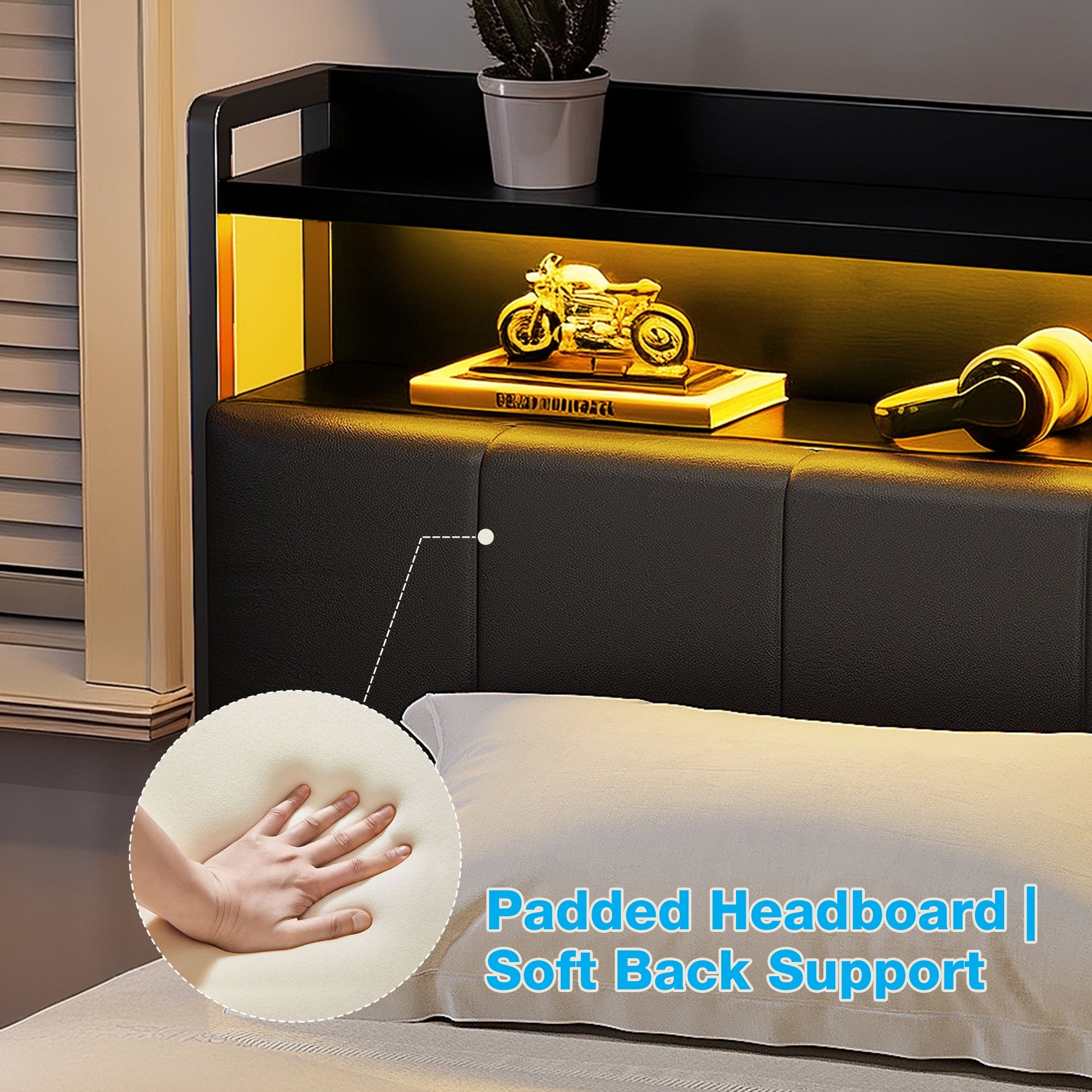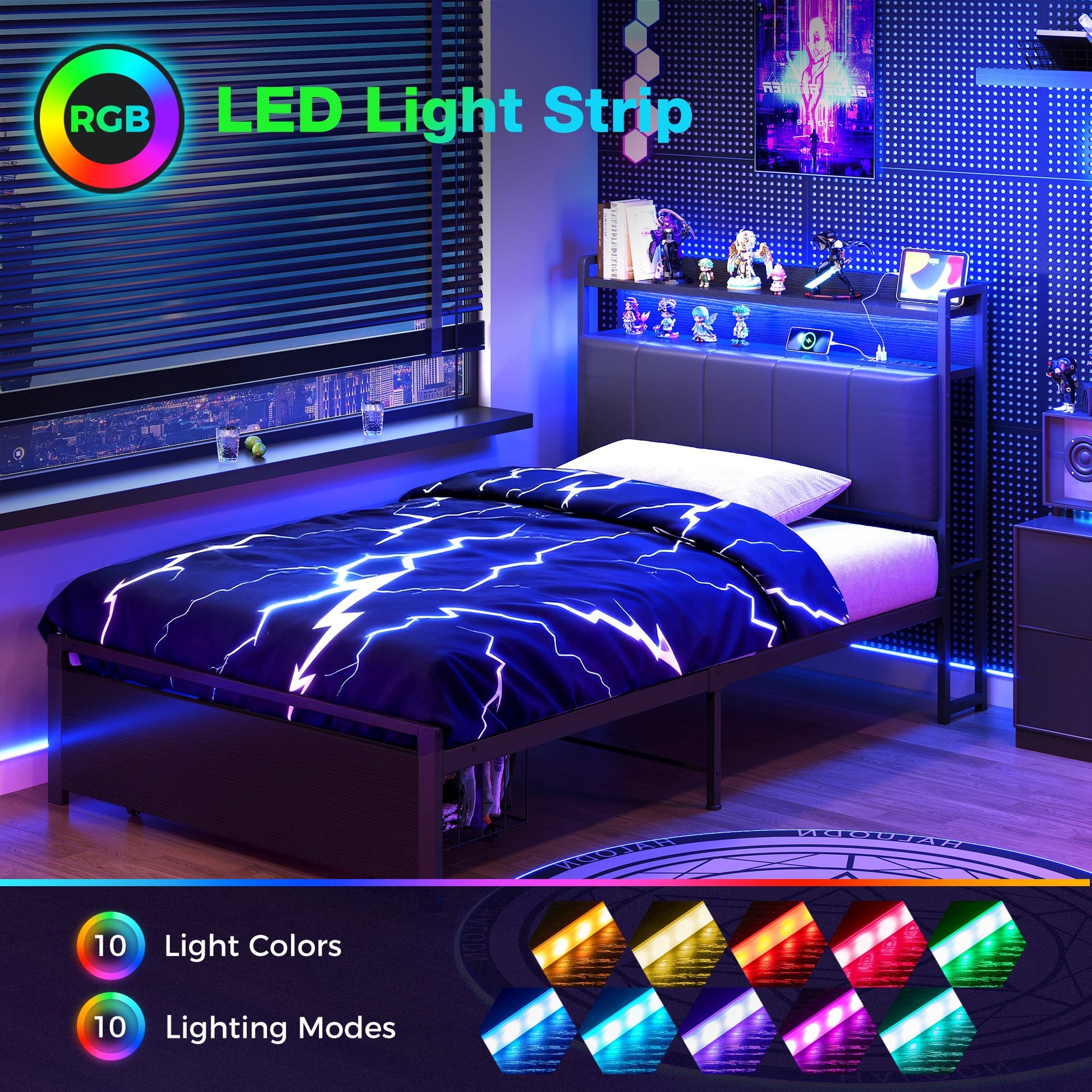 - Cozy Headboard & Adjustable Lighting: The padded tech fabric headboard offers superior comfort for reading or relaxing. The RGB LED light strip features 10 color options and 10 lighting modes, easily adjusted via remote to create your ideal nighttime ambiance.