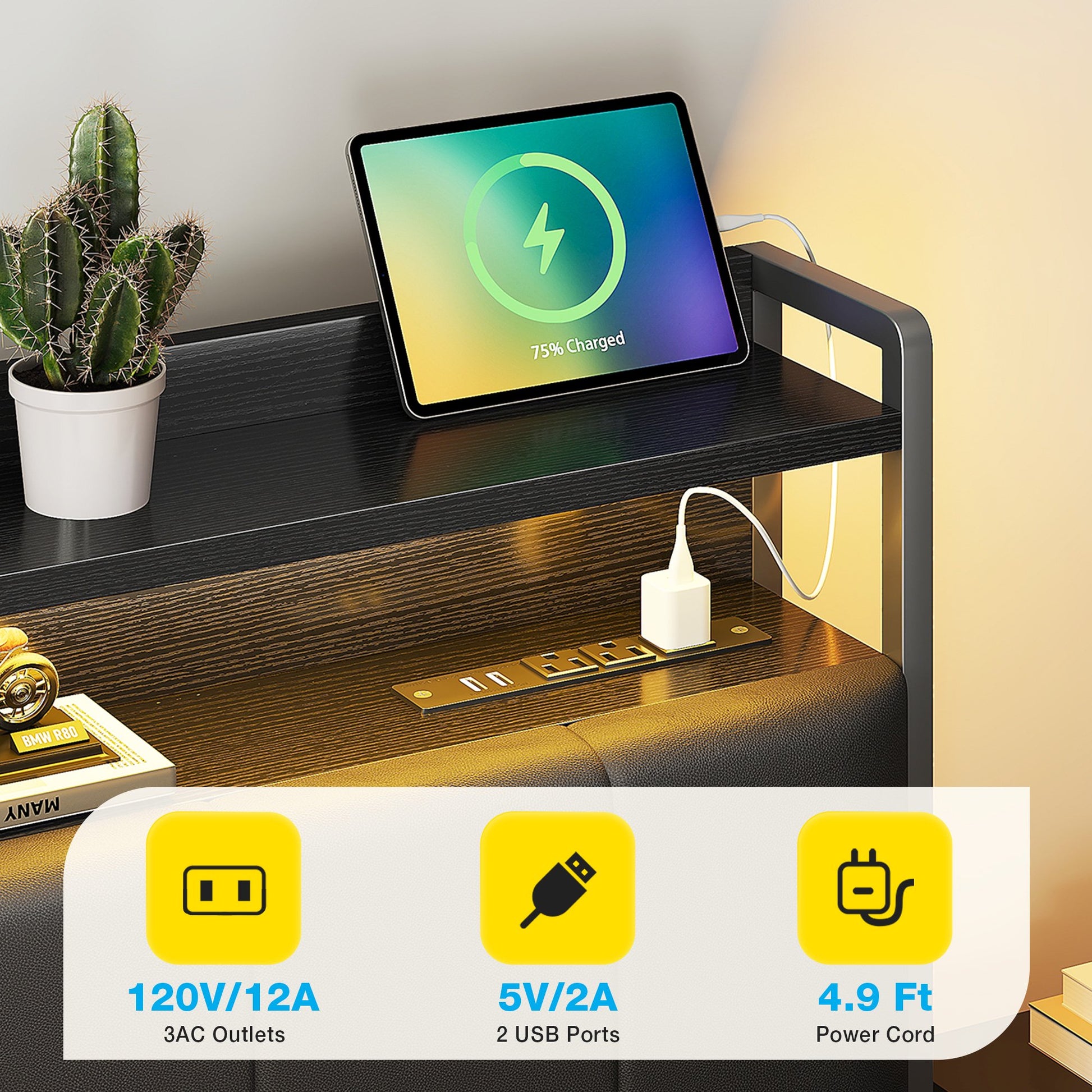 Bed Frame Twin Size with Storage Headboard, Upholstered Platform Bed with Charging Station and LED Light, Heavy Duty Frame Support, No Box Spring Needed, Noise Free, Black