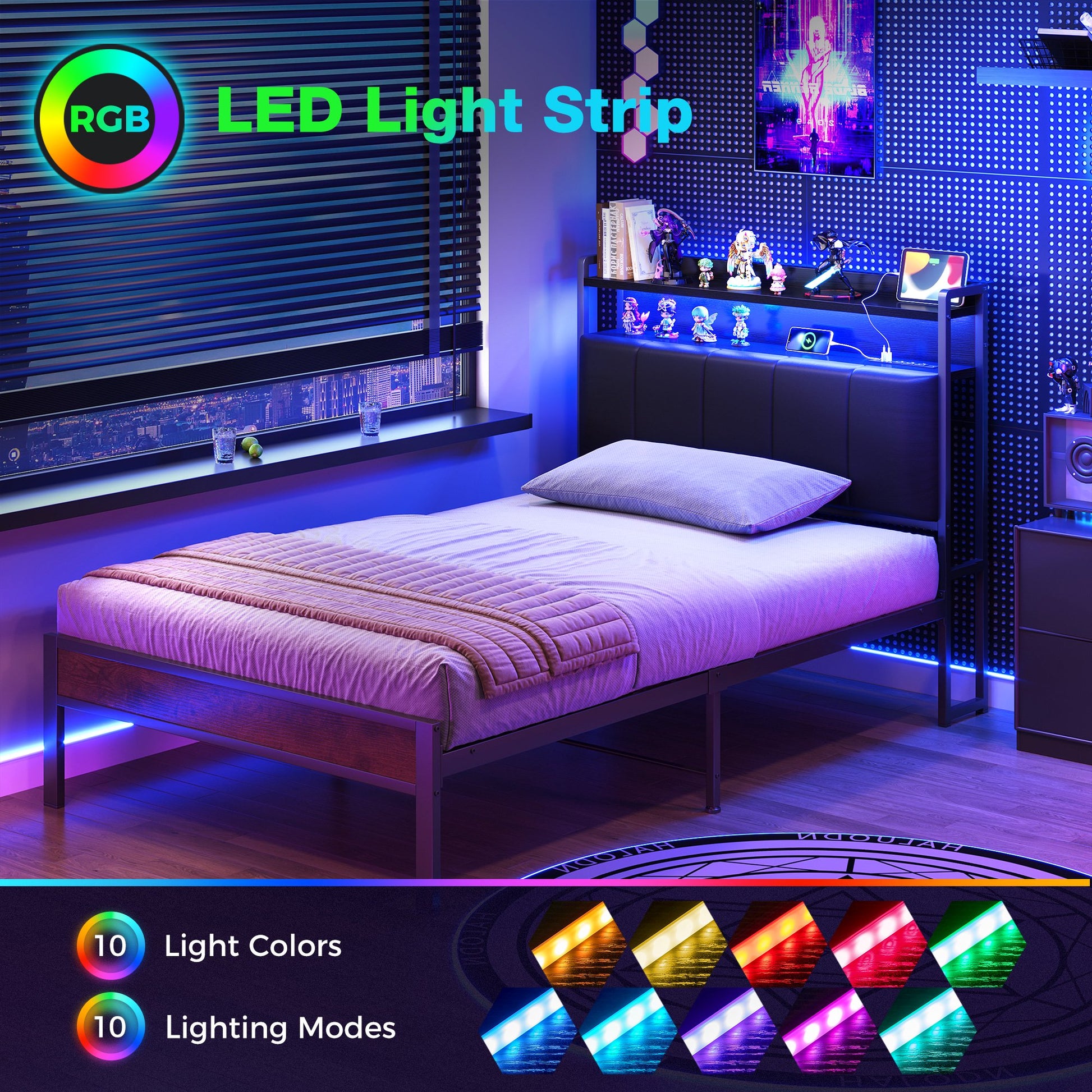 Transform your bedroom into a stylish and functional space with this modern bed frame — perfect for sleep, storage, and relaxation. The headboard is upholstered in soft tech fabric and padded with high-density foam, providing exceptional comfort for reading or lounging. With built-in shelves, it offers a convenient spot to display books, toys, or décor items. The RGB LED lights on the headboard feature 10 color options and 10 lighting modes, easily adjusted with a remote to create the perfect ambiance for any mood or bedtime routine. The built-in charging station with two outlets and two USB ports keeps all your devices powered and within reach. Easy to assemble with clear instructions, this bed frame combines comfort, practicality, and modern style — making it an ideal addition to any teen’s or young adult’s bedroom.