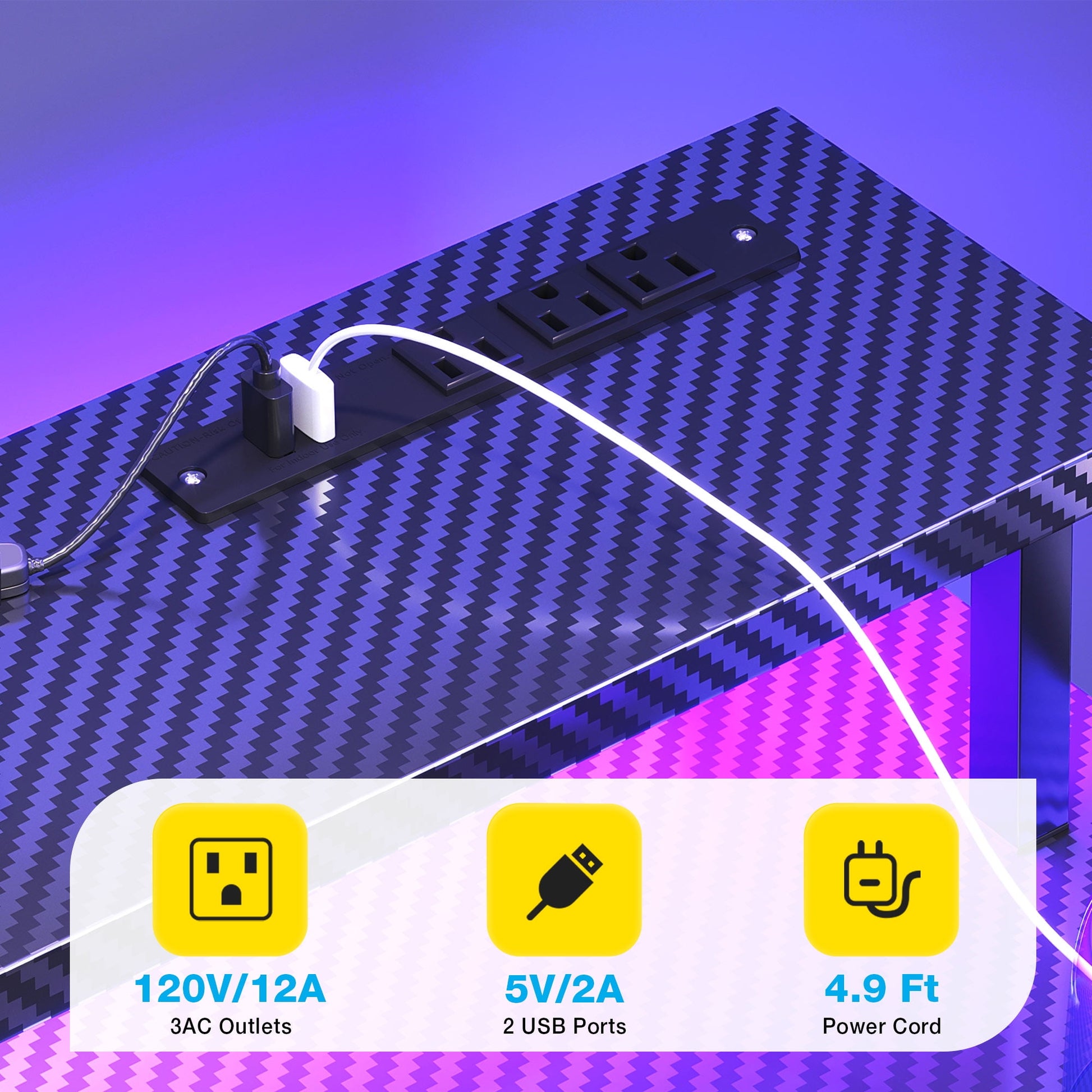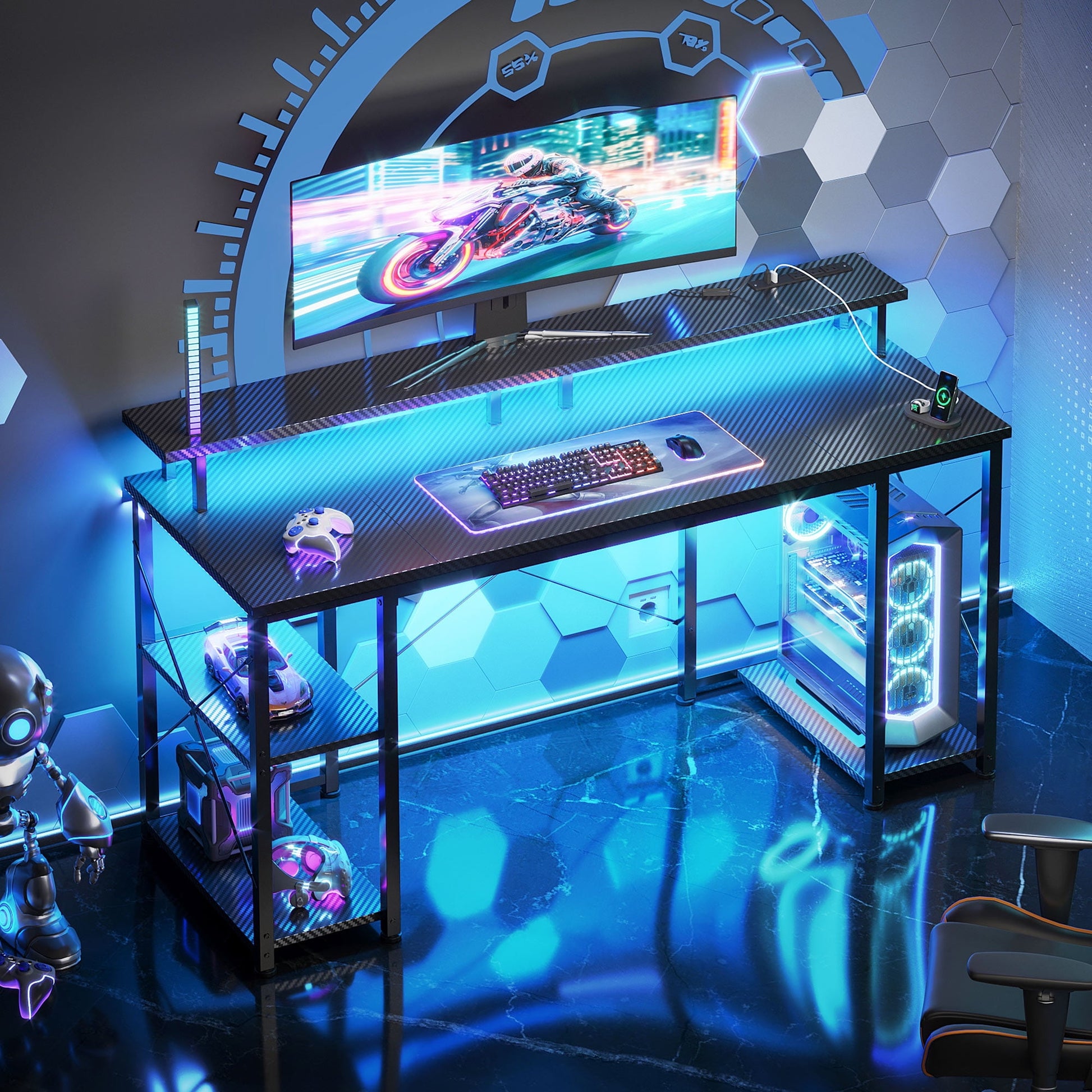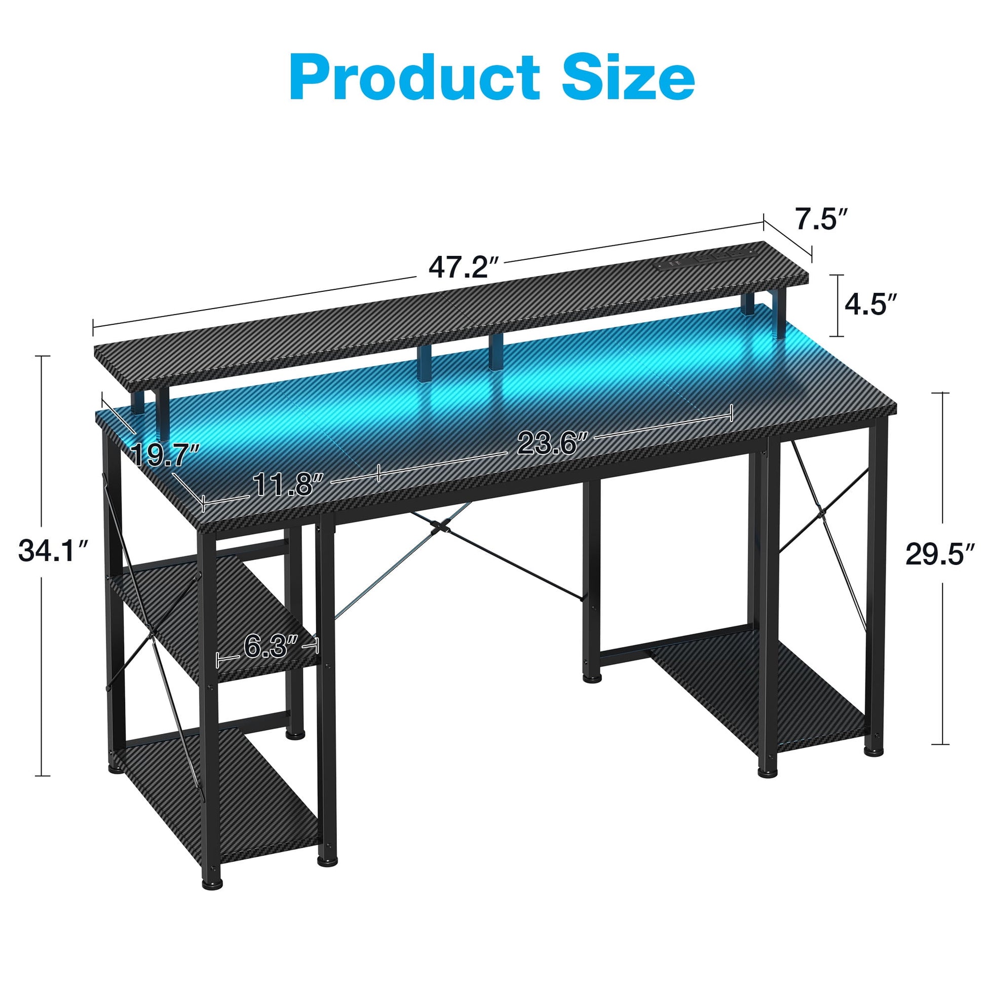 Our desk's surface is finished with sleek black carbon fiber, offering a smooth texture that's resistant to scratches, avoiding scratches in daily use.This desk is equipped with a LED light strip. You can easily switch between different lighting modes according to your personal preferences, creating an immersive gaming atmosphere. The desk comes equipped with a monitor stand, which is perfect for holding your monitor securely in place. Underneath the desk, there's a handy storage shelf and a CPU stand that provide extra space to store your computer host, books, collectibles, and gaming magazines, keeping your area neat and organized. Additionally, the built - in power outlets and USB ports ensure that all your devices can be charged conveniently at any time, eliminating the need for messy extension cords and extra data cables. Whether you're a hardcore gamer or a busy professional, this gaming desk is the ultimate addition to your space.