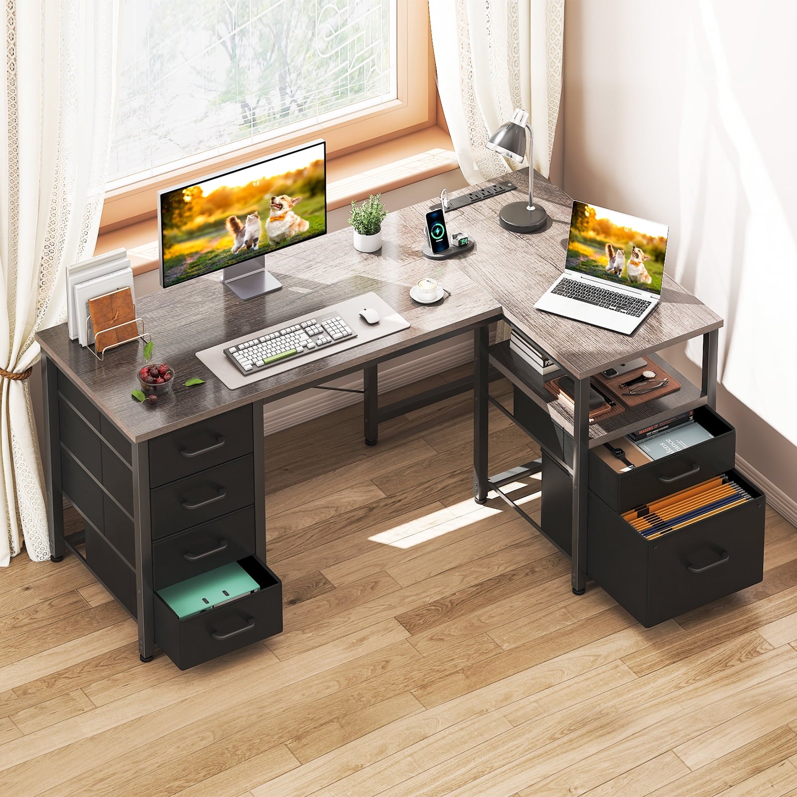 Maximize your workspace with this versatile L-shaped desk from Casacomoda. Featuring built-in power outlets with 3 AC ports, 1 USB, and 1 Type-C port, you can easily charge your devices without leaving your desk. The desk offers ample storage solutions with five fabric drawers and a spacious file drawer, keeping your office supplies and gaming gear organized. The reversible design allows you to customize the layout to suit your space, while the wider desktop provides plenty of room for laptops, printers, and more. Crafted with a durable particleboard surface and a sturdy metal frame, this desk is scratch-resistant, waterproof, and built to last, ensuring a long-lasting and stylish addition to your home or office.