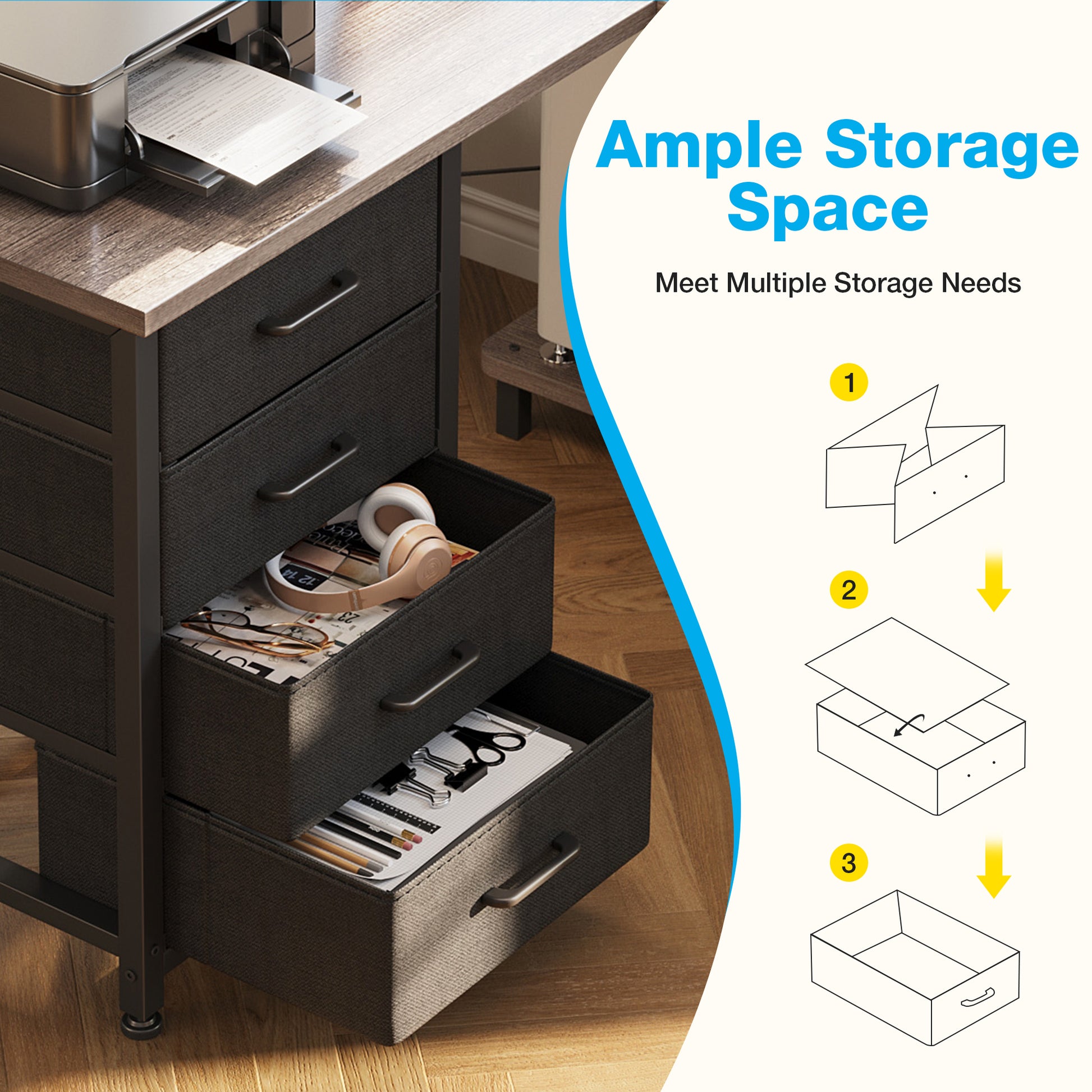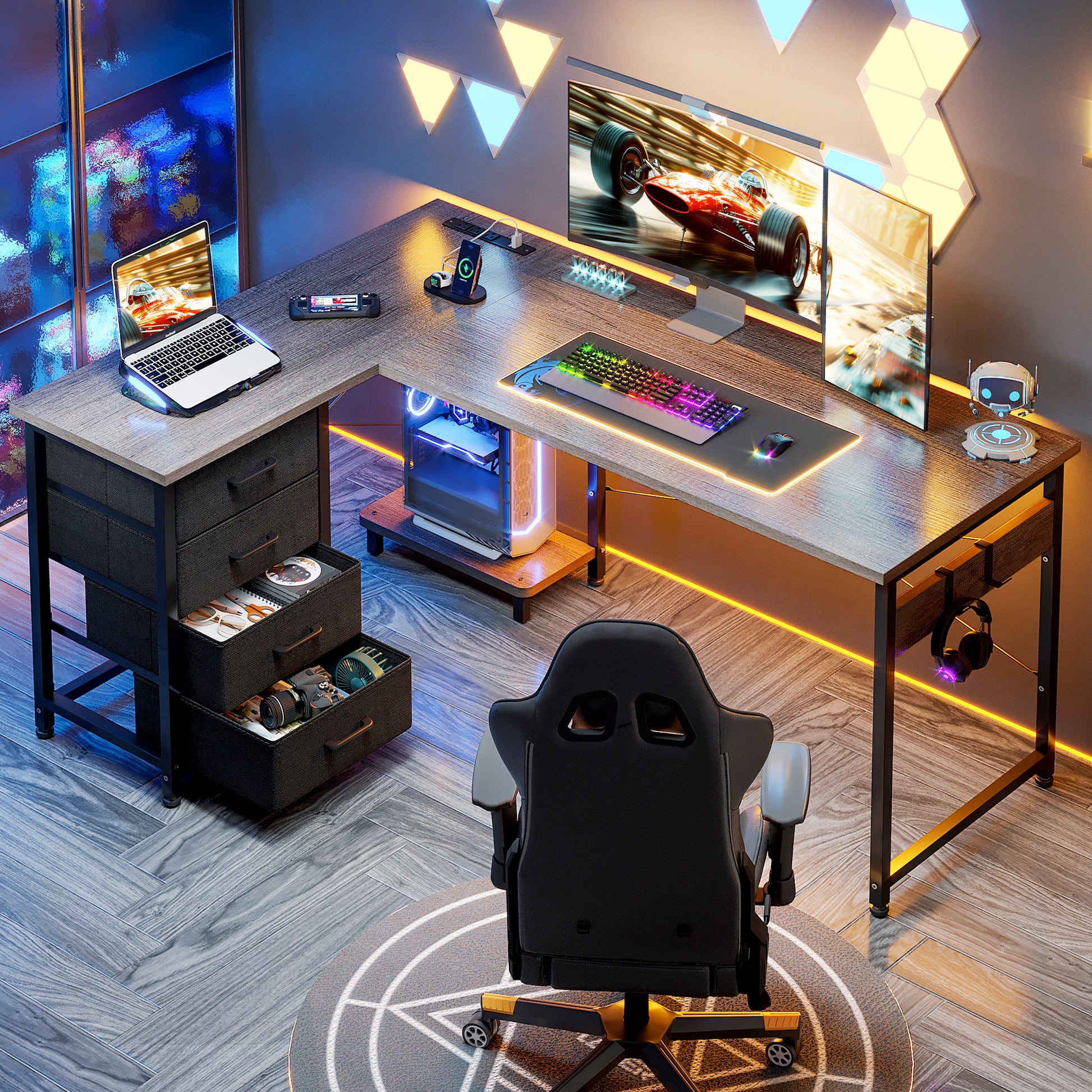 Elevate your workspace with this L-shaped desk. This modern and versatile desk features 4 spacious drawers and 2 sturdy hooks for optimal storage. The built-in power outlet with 3 AC outlets and 2 USB ports allows easy device charging. Designed with a convenient host stand to free up space, this desk offers both functionality and comfort. Made with durable, waterproof boards and a strong iron frame, it offers long-lasting performance, while adjustable foot pads provide stability. Designed for both home and office use, this desk provides a functional and stylish solution to organize your work area.
