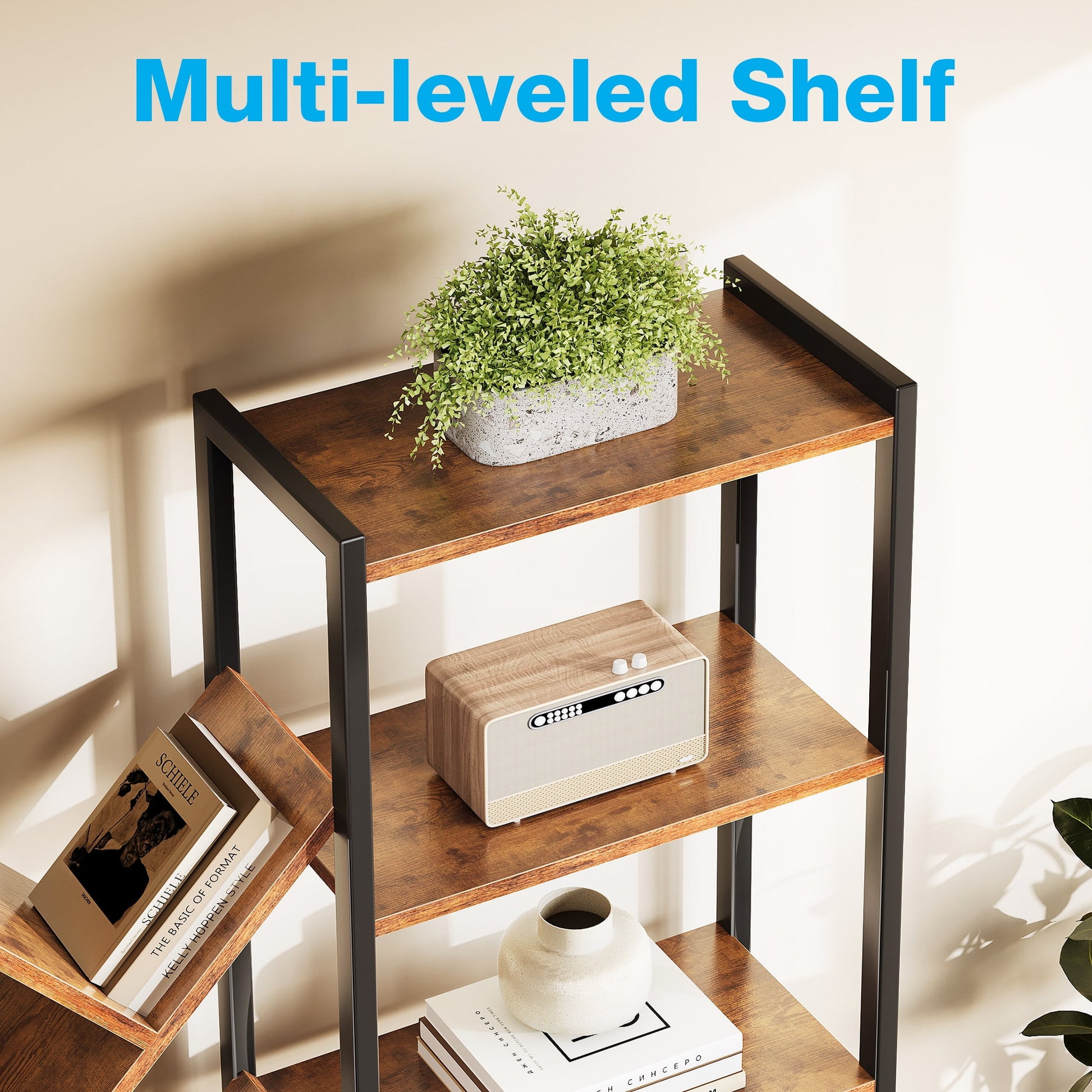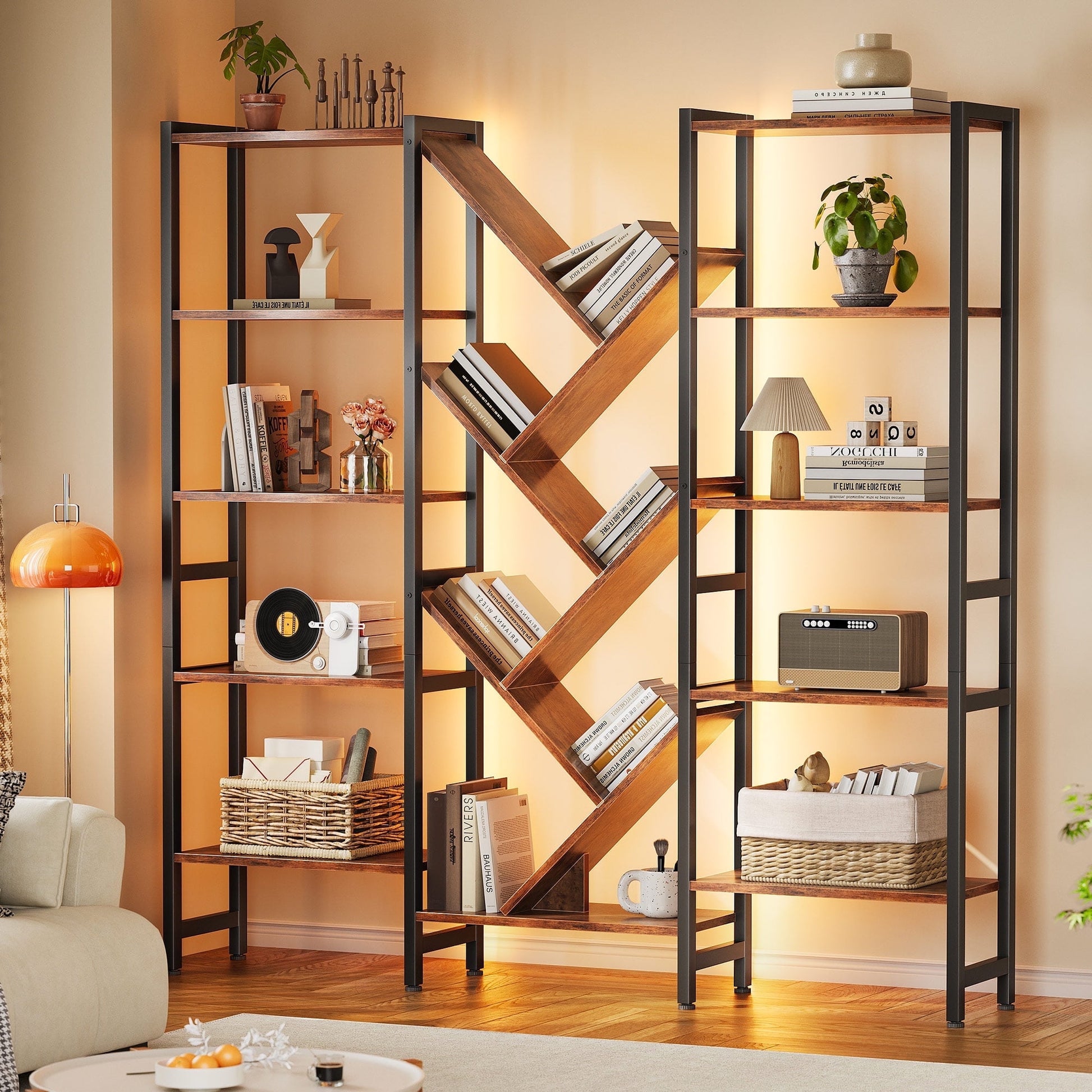 Designed for young adults and families who value both function and ambiance, this triple 5-tier bookshelf features 17 open shelves and built-in RGB LED light strips controlled via an app. With over 6000 color options and music sync mode, you can easily create the perfect atmosphere for reading, gaming, or relaxing. Its artistic tree design maximizes storage space while adding a modern rustic charm to any living room, bedroom, or home office. Constructed with a durable metal frame, X-shaped brackets, adjustable feet, and an anti-tipping kit, this large bookcase ensures superior stability and safety. The rustic brown wood finish complements any décor, while the waterproof surface makes cleaning simple. Easy to assemble with numbered parts, this LED bookshelf combines practicality, style, and creativity in one statement piece.