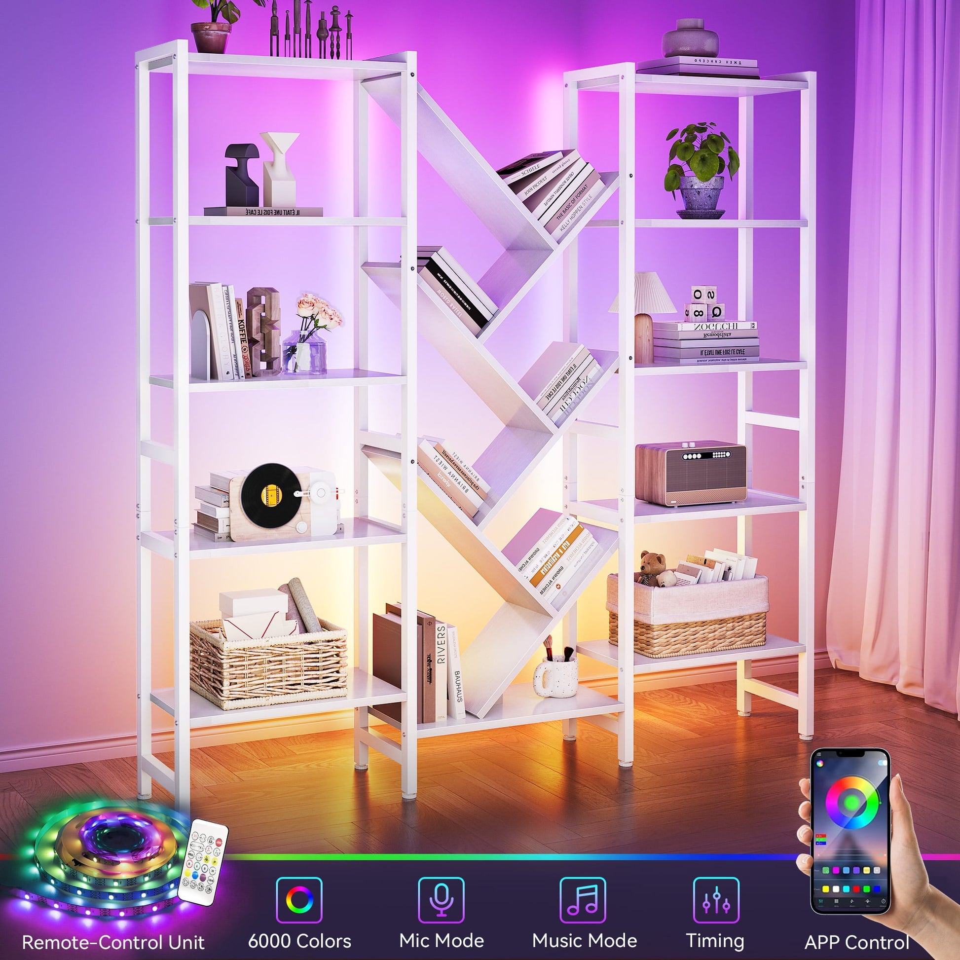 Triple 5-Tier Bookshelf with LED Lights for Living Room, 17 Open Shelves Large Bookcase with App Control RGB Light Strip, Modern Tree Design Storage Shelf with Metal Frame, White